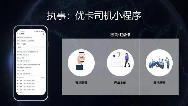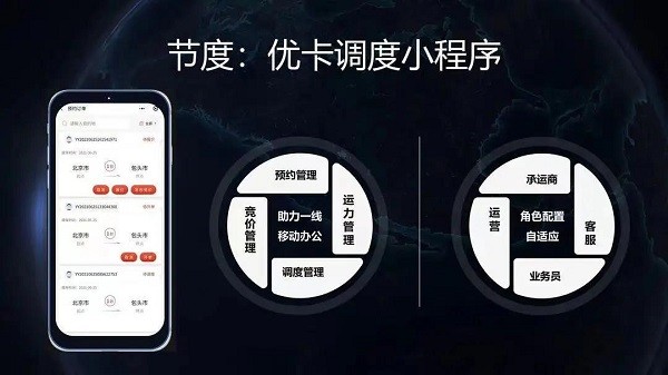 打開優(yōu)卡運車調(diào)度小程序——預(yù)約管理、調(diào)度管理;競價管理、運力管理;手機在手,操盤全國。承運商、運營商、客戶、業(yè)務(wù)員,所有角色自適應(yīng)配置,從訂單接收到車輛運抵的所有動作監(jiān)管,從車隊數(shù)字化管理到對線路匹配,再到運力調(diào)撥進(jìn)行資源優(yōu)化,最終實現(xiàn)降本增效。