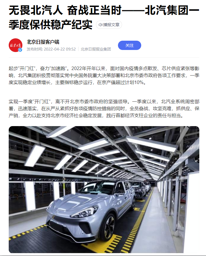 起步“開門紅”,奮力“加速跑”。2022年開年以來,面對國內(nèi)疫情多點散發(fā)、芯片供應(yīng)緊張等影響,北汽集團積極貫徹落實黨中央國務(wù)院重大決策部署和北京市委市政府各項工作要求,一季度實現(xiàn)穩(wěn)定業(yè)績增長,主要指標穩(wěn)步運行,在京產(chǎn)值超過計劃10%。
